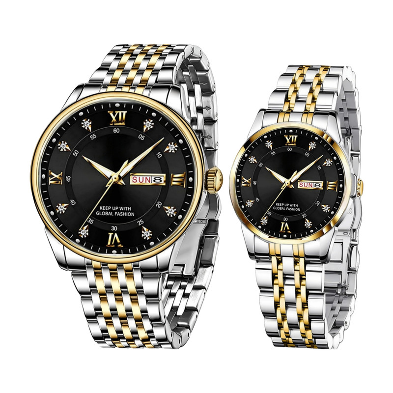 ست ساعت مچی عقربهای زنانه و مردانه مدل کوارتز الماسی دو تقویم کد 104