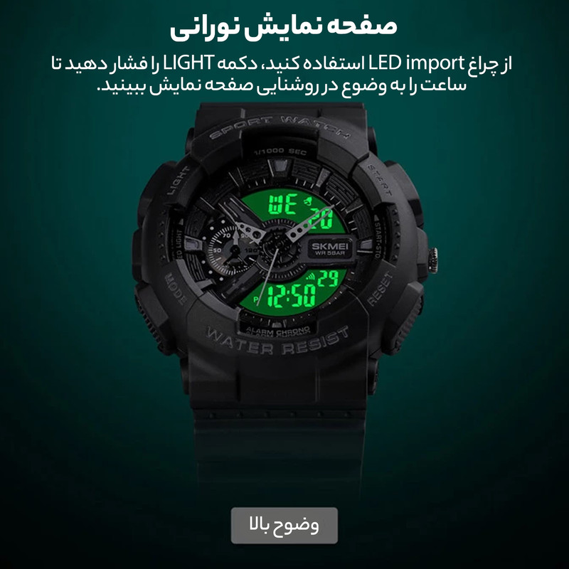 نمایش 24 ساعته, نمایش ساعت دوم, تاریخشمار, نور پسزمینه, تایمر |