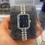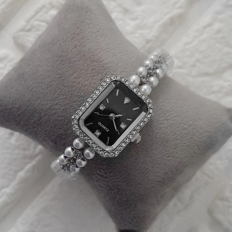 ساعت مچی عقربهای کوارتز زنانه مدل لوکس بند دستبندی مرواریدی قاب دور شنی نگین دار کد ۱.۶