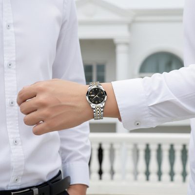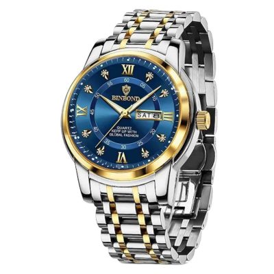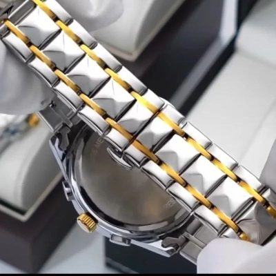 بررسی تخصصی بدنهی نقرهای براق و بند فلزی دو رنگ نقرهای-طلایی ساعت مچی عقربهای مردانه کوارتز مدل کلاسیک، جلوهای مدرن