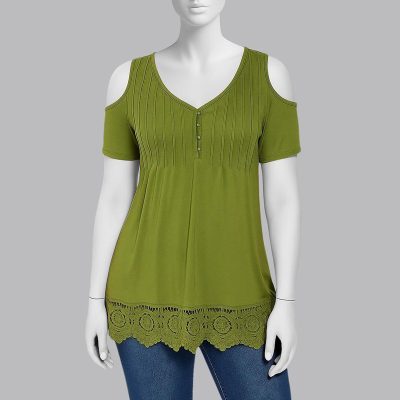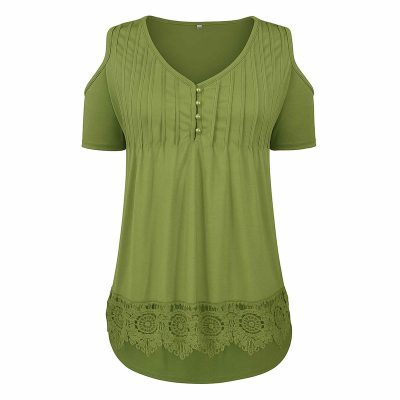 بلوز آستین کوتاه یقه هفت زنانه مدل نخی لبه گیپور رنگ سبز سدری