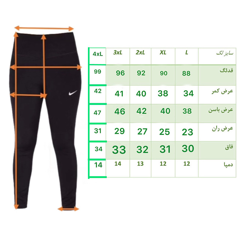 لگ ورزشی زنانه مدل Nk-S001 از پارچه فلامنت شلواری اعلا (غواصی مخصوص لگ) توليد شده است و دارای کش کمر گنی (10cm)