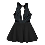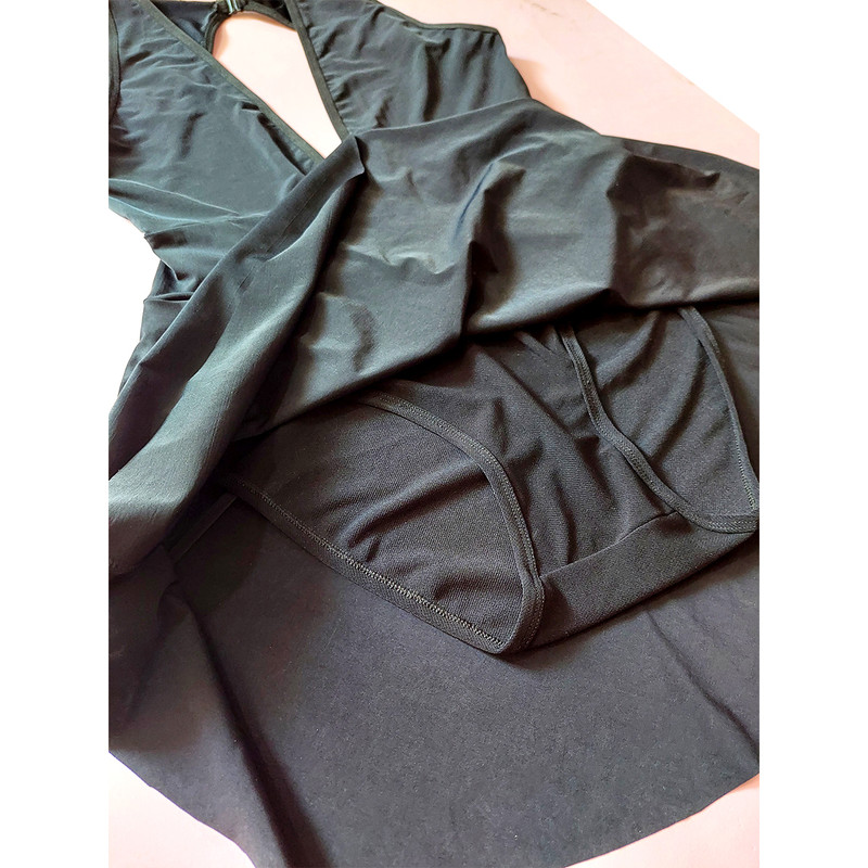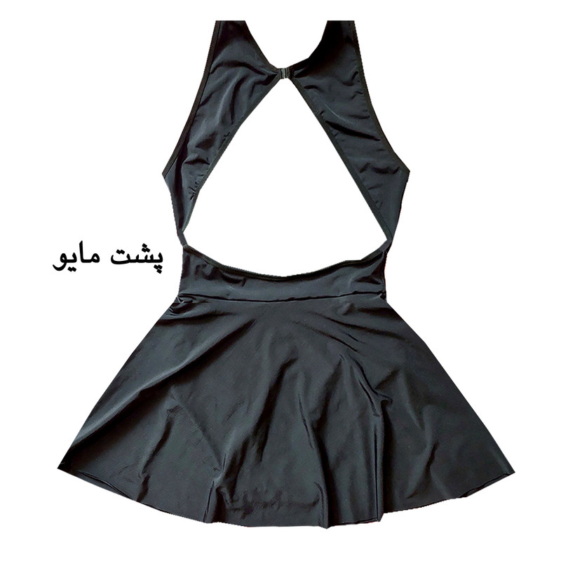 این مایو زنانه با رنگ کاملا مشکی بوده و مدل آن بینظیر است. این مایو انتخاب مناسبی برای افرادی است که خواستار لباس شنای دامنی هستند. در عین حال مایو دارای شورت وصل شده نیز میباشد. پشت مایو کاملا باز بوده و تنخور آن بسیار زیباست.