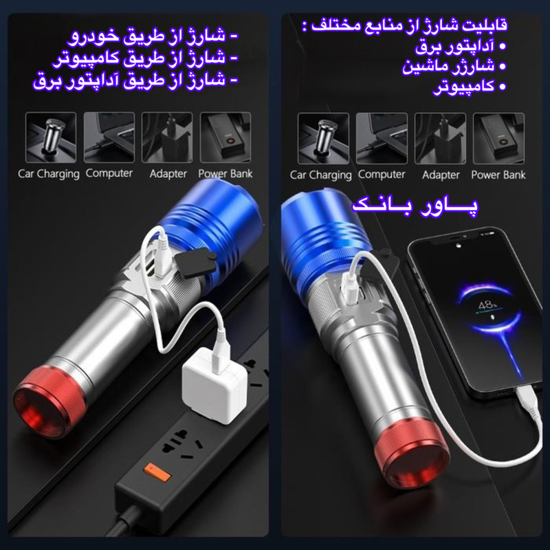 استفاده از چراغ قوه SD-7173 بسیار ساده است. کافی است کابل USB را به چراغ و منبع برق متصل کنید و وضعیت شارژ را از طریق چراغ نشاندهنده بررسی نمایید. پس از تکمیل شارژ و تغییر رنگ چراغ نشاندهنده، دستگاه را از برق جدا کرده و درپوش ضدآب را ببندید تا از نفوذ آب و گرد و غبار جلوگیری شود.